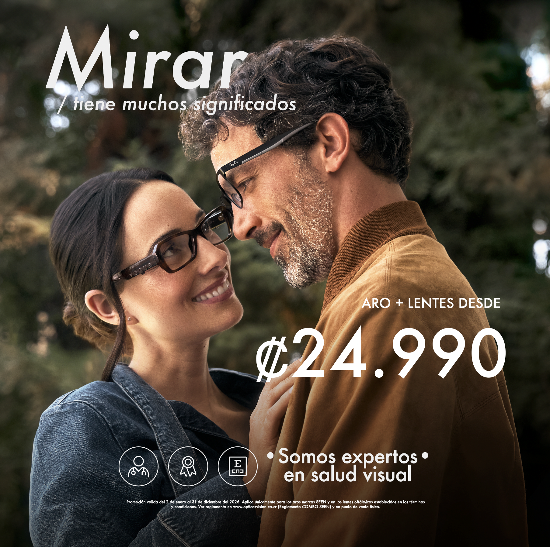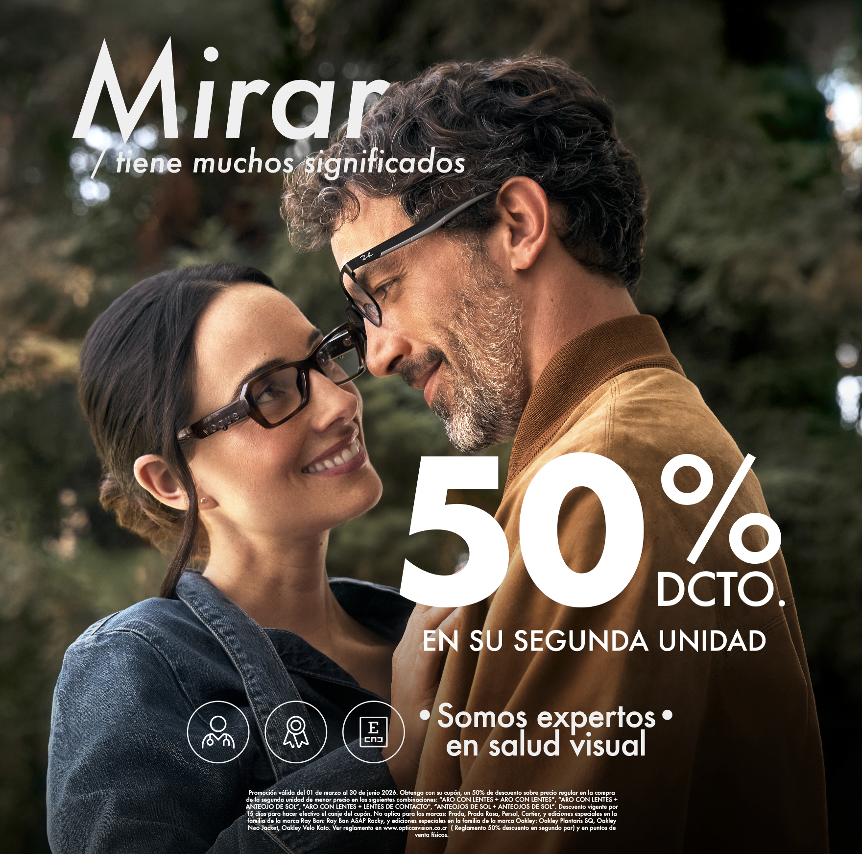 Obtenga con su cupón, un 50% de descuento sobre precio regular en la compra de la segunda unidad de menor precio en las siguientes combinaciones: “ARO CON LENTES + ARO CON LENTES”, “ARO CON LENTES + ANTEOJO DE SOL”, "ARO CON LENTES + LENTES DE CONTACTO", “ANTEOJOS DE SOL + ANTEOJOS DE SOL”. Descuento no aplica en líquidos y/o accesorios. Promoción no aplica para las siguientes marcas: Prada, Prada Rosa, Persol, Cartier, y ediciones especiales en la familia de la marca Ray Ban: Ray Ban ASAP Rocky, y ediciones especiales en la familia de la marca Oakley: Oakley Plantaris SQ, Oakley Neo Jacket, Oakley Velo Kato. Descuento no acumulable con otras promociones y/o descuentos. Promoción válida del 01 de marzo al 30 de junio 2026 en tiendas físicas Ópticas Visión y www.opticasvision.co.cr "Descuento vigente por 15 días para hacer efectivo el canje del cupón."