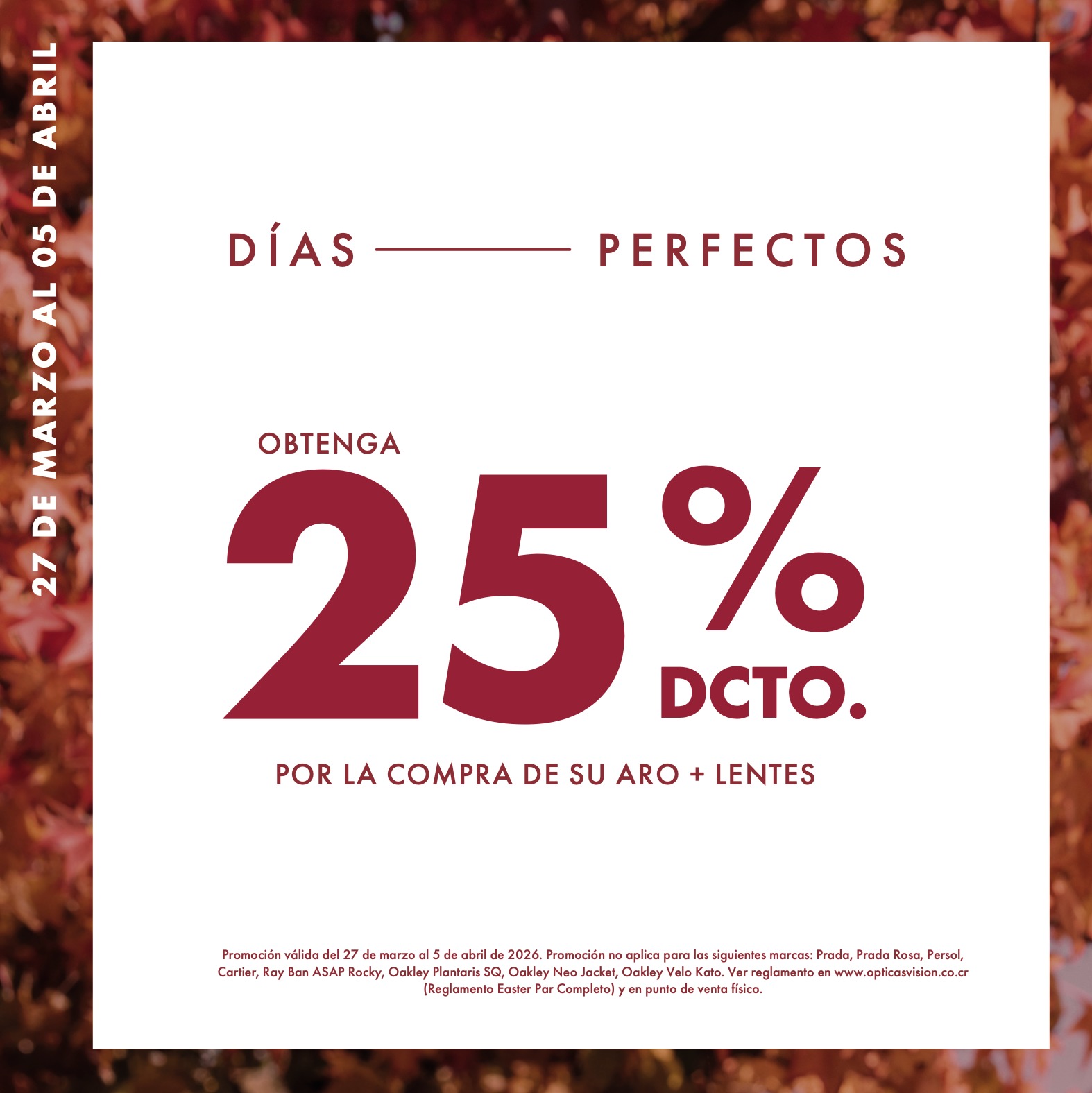 btenga un 25% de descuento sobre precio regular en la compra de un par completo: “ARO + LENTES” en un mismo aro. Descuento no aplica en líquidos y/o accesorios. Descuento no aplica en líquidos y/o accesorios. Promoción no aplica para las siguientes marcas: Ray-Ban ASAP Rocky. Oakley Plantaris, Plantaris SQ, Neo Jacket, Suture Jacket, Velo Kato. Cartier, Prada Group - (Prada, Prada Linea Rossa, Miu Miu), Persol & Moncler. Descuento no acumulable con otras promociones y/o descuentos. Promoción válida del 27 de marzo al 05 de abril 2026. Ver reglamento (Easter Par Completo) en tiendas físicas Ópticas Visión y www.opticasvision.co.cr.