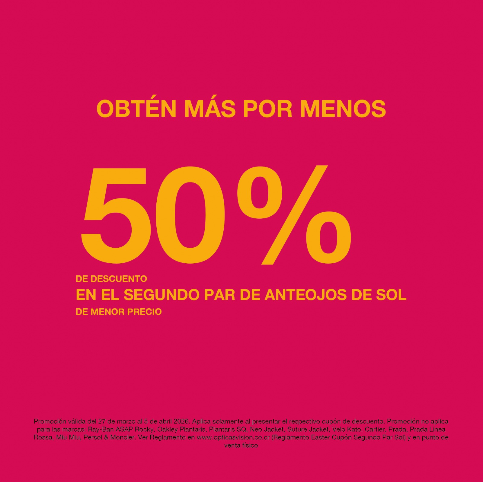 Promoción válida del 27 de marzo al 5 de abril 2026. Aplica solamente al presentar el respectivo cupón de descuento. Promoción no aplica para las marcas: Ray-Ban ASAP Rocky, Oakley Plantaris, Plantaris SQ, Neo Jacket, Suture Jacket, Velo Kato. Cartier, Prada, Prada Linea Rossa, Miu Miu, Persol & Moncler. Ver Reglamento en www.opticasvision.co.cr (Reglamento Easter Cupón Segundo Par Sol) y en punto de venta físico